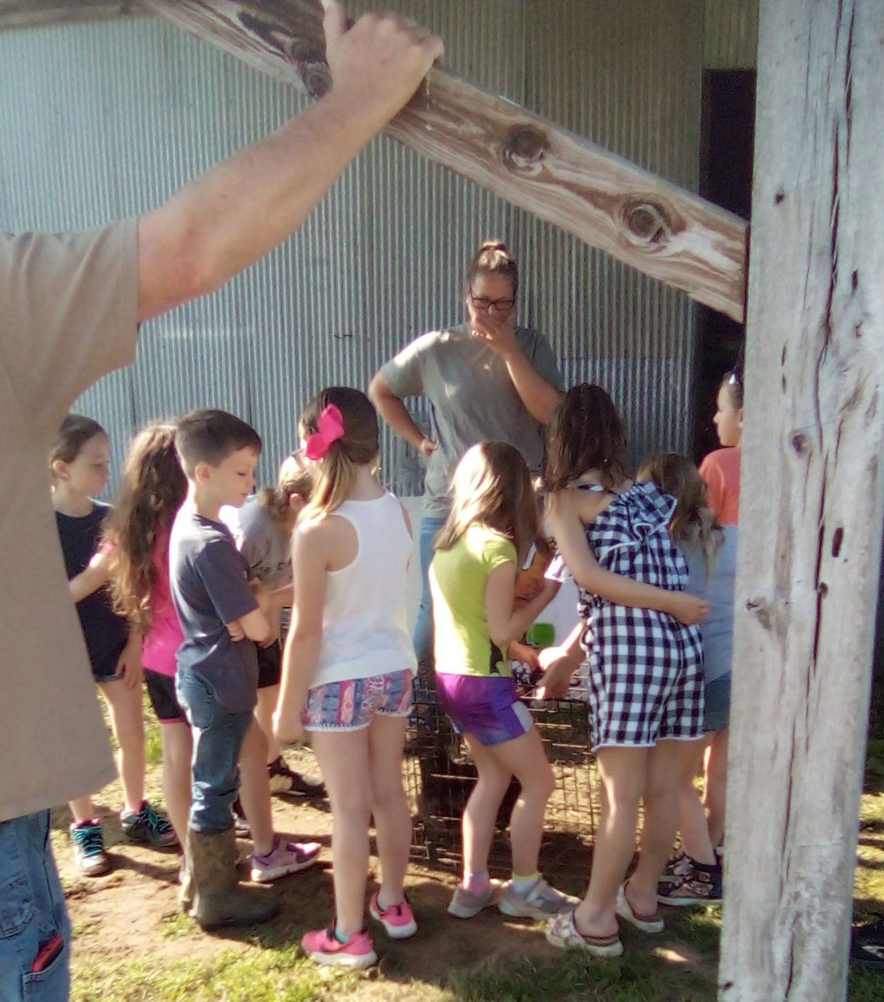 Kids at chicken station surrounding chicken cage on Ag Day 22