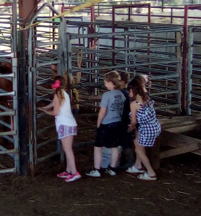Several 2nd graders looking at a calf through cattle panel at Ag Day 22