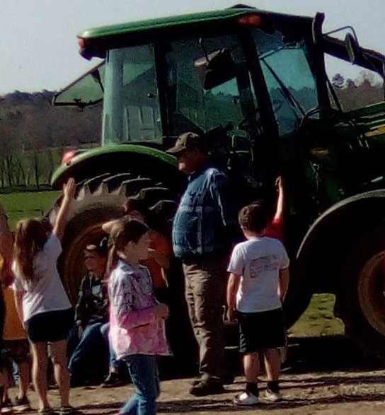 Presenter and a couple of 2nd graders looking at a tractor at Ag Day 22