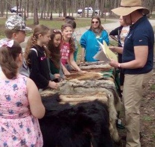 Students and presenter are gathered around a table with furs at the Mammal Fur station at the Eco Day at the Piney Wood Rec Area