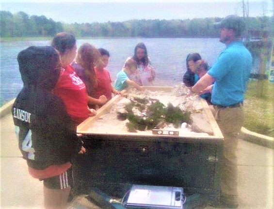 Students and presenter gathered around stream table presentation at the Eco Day at the Piney Wood Rec Area